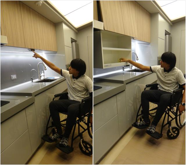 日本的橱柜做的是按钮式升降篮,即便你坐着轮椅,吊柜上的东西,想拿就拿,想放就放,很是方便