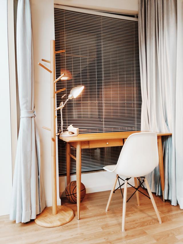 榻榻米另一边是男主人办公学习区,树形挂衣架让空间一点都不浪费。